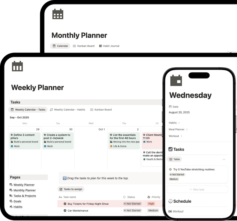 The All-in-One Notion Planner includes this Task Manager Template along with integrated views for projects, goals, and habit tracking — all perfectly connected in one Notion workspace.